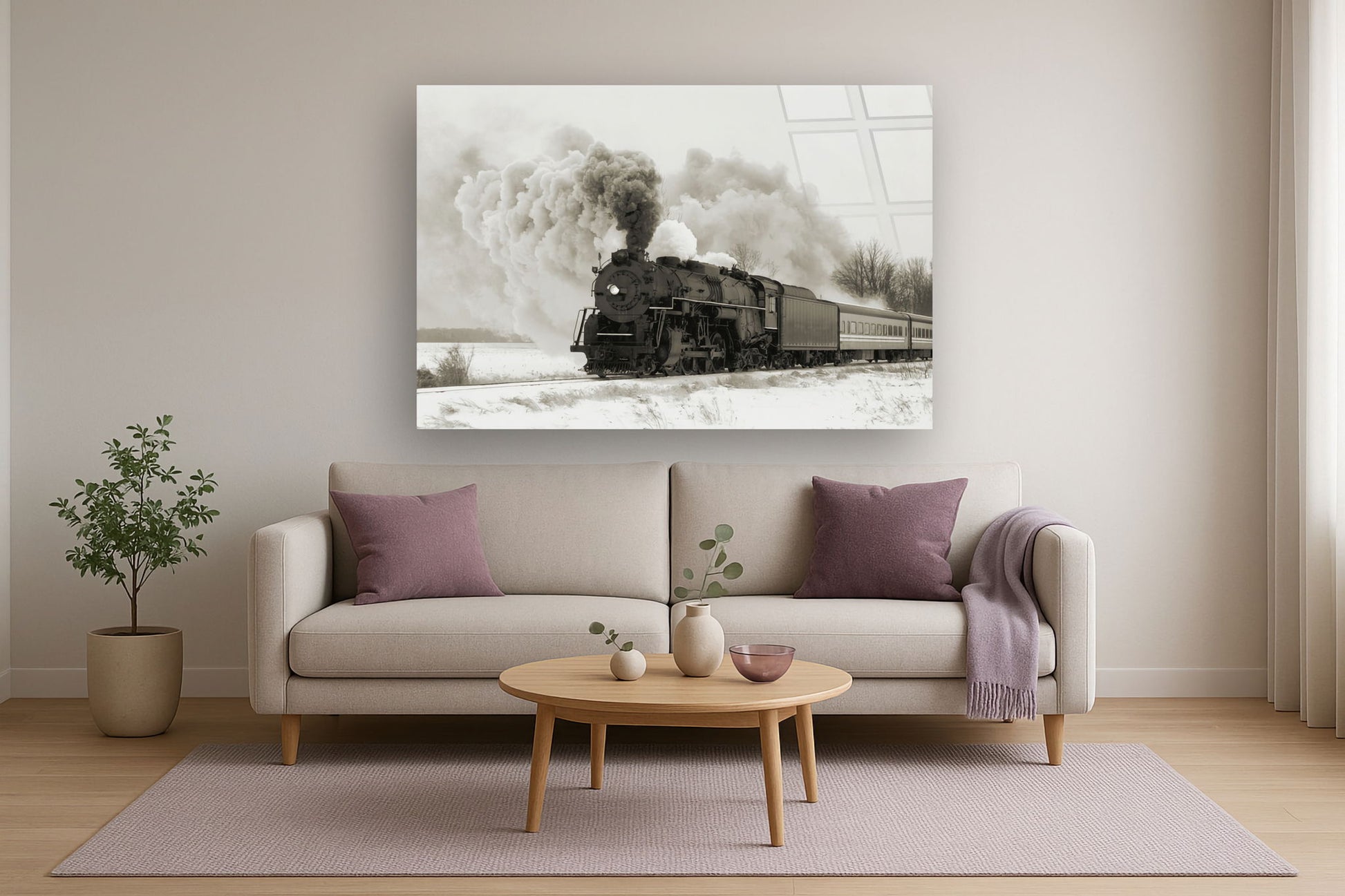 Experience the nostalgic power of "Railroad Smoke," a striking contemporary photograph printed and hand-embellished beneath durable tempered glass. This captivating image of a vintage steam locomotive billowing thick smoke across a snowy landscape brings a dramatic sense of motion and history to any living room, office, or den. The sleek, frameless design with a dimensional finish offers a modern aesthetic while the tempered glass ensures safety and strength. Ready to hang with angled sawtooth hangers, this piece also supports a meaningful cause by donating a meal to a hungry American child with every purchase.