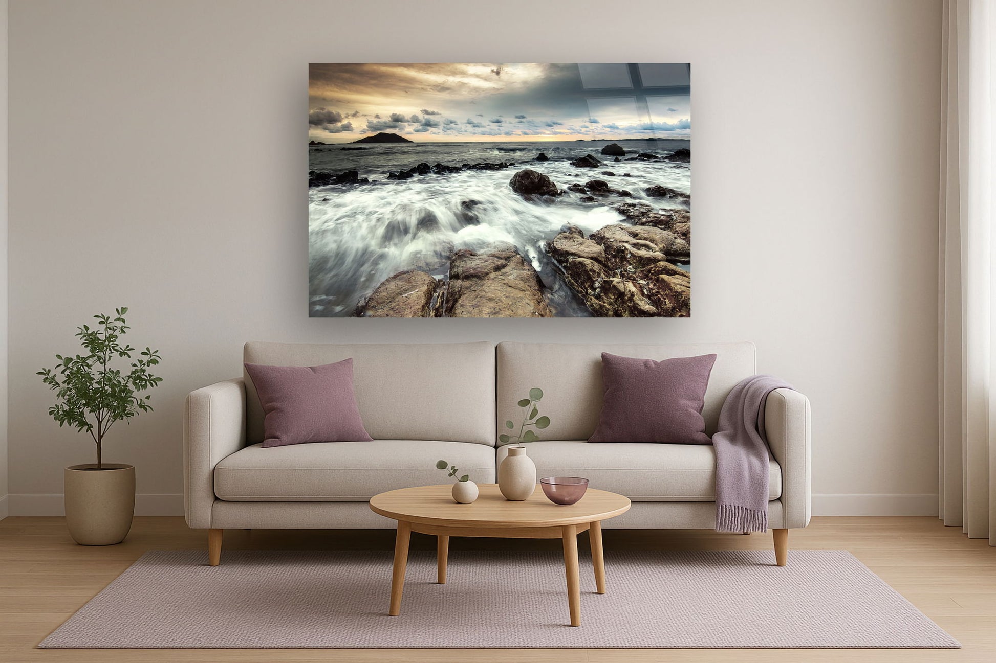 Experience the dynamic beauty of the coast with "Breaking Water," a stunning photographic wall art piece printed and hand-embellished beneath tempered glass. This contemporary artwork captures the mesmerizing motion of waves crashing over rugged rocks under a dramatic sky, offering a sleek, dimensional finish that adds depth and shine to any living room or office space. Crafted with durable tempered glass, it ensures safety and strength while providing a clean, frameless look with easy-to-hang sawtooth hangers. With each purchase, you also contribute to feeding hungry children, making this piece both a visual and social treasure.