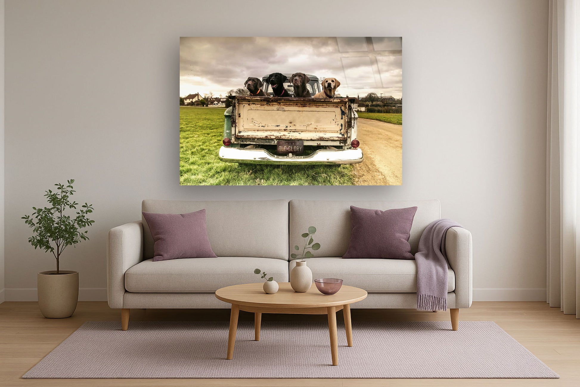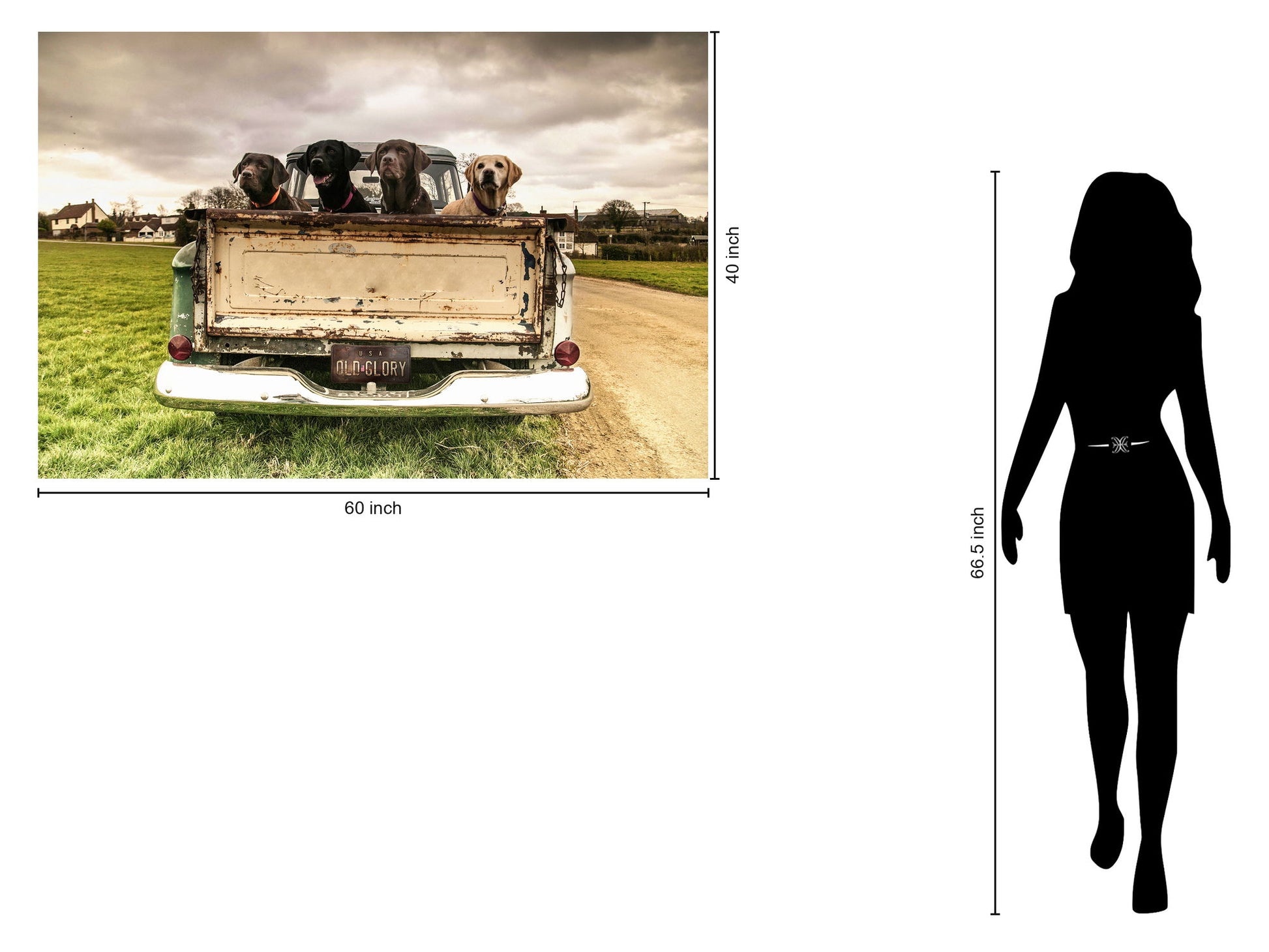 "Old Glory" captures a nostalgic moment with four dogs sitting in the bed of a vintage truck, set against a rustic countryside backdrop. Printed on tempered glass, this piece blends durability with striking visual depth, enhanced by hand-embellished details beneath the glass surface. The artwork’s warm, earthy tones and timeless subject evoke a sense of comfort and Americana charm, making it a perfect addition to living rooms, offices, or dens. Ready to hang with sawtooth hangers, it offers both style and ease for your wall décor while supporting a social cause with every purchase.