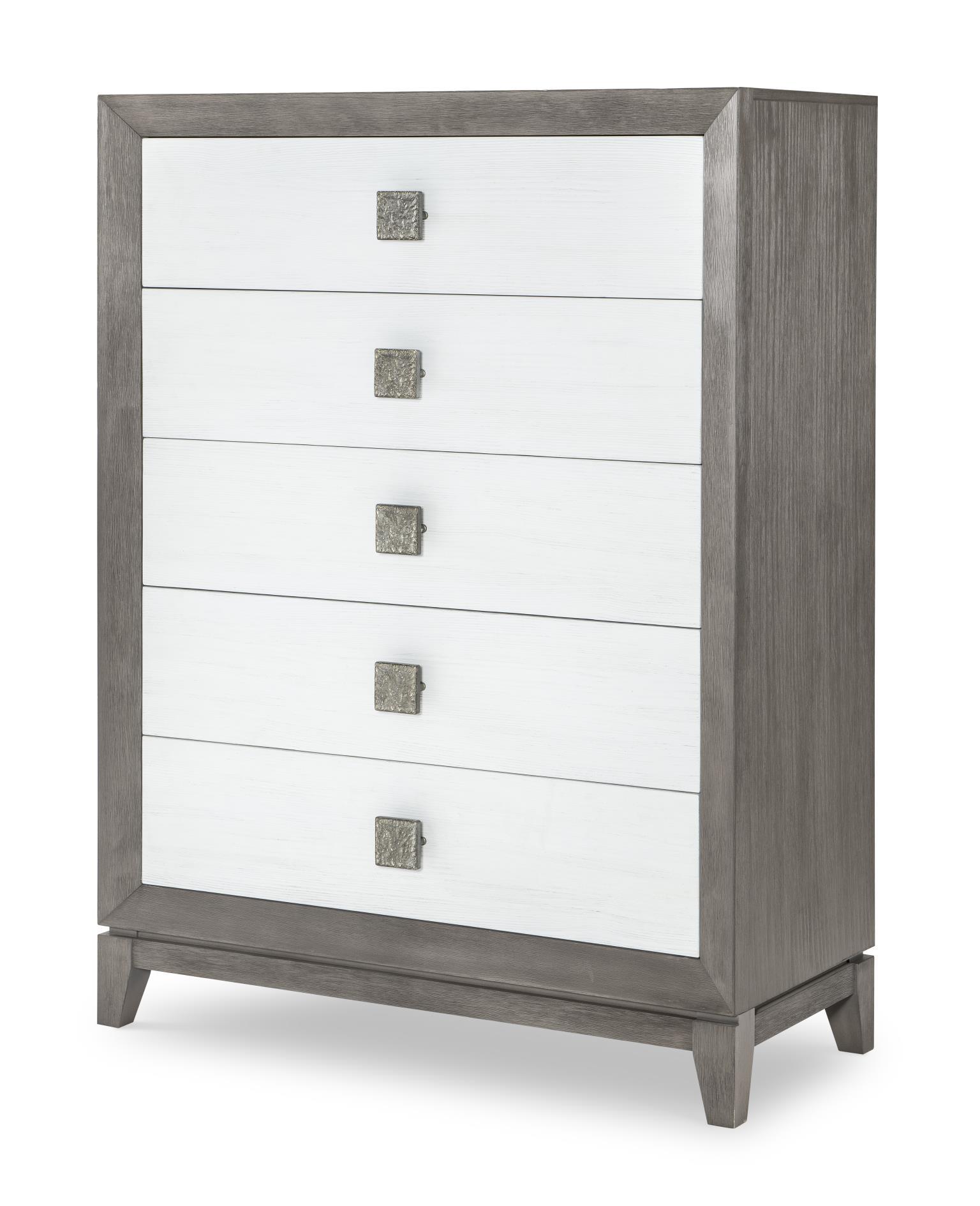 Angular modern shapes, organic textures and mixed materials combine with a gray, cream, and metallic color palette to create a crisp modern look in the Terra Luna whole home furniture collection. The deeply wire-brushed Nightfall finish gives a tactile, dimensional texture, contrasting with the White Cloud case fronts and upholstery and metallic-finished table and chair bases. Over scaled, jewelry-like Polished Nickel hardware adds a glam touch. The clean silhouettes paired with natural color tones and organic textures give a minimalist yet inviting appeal.