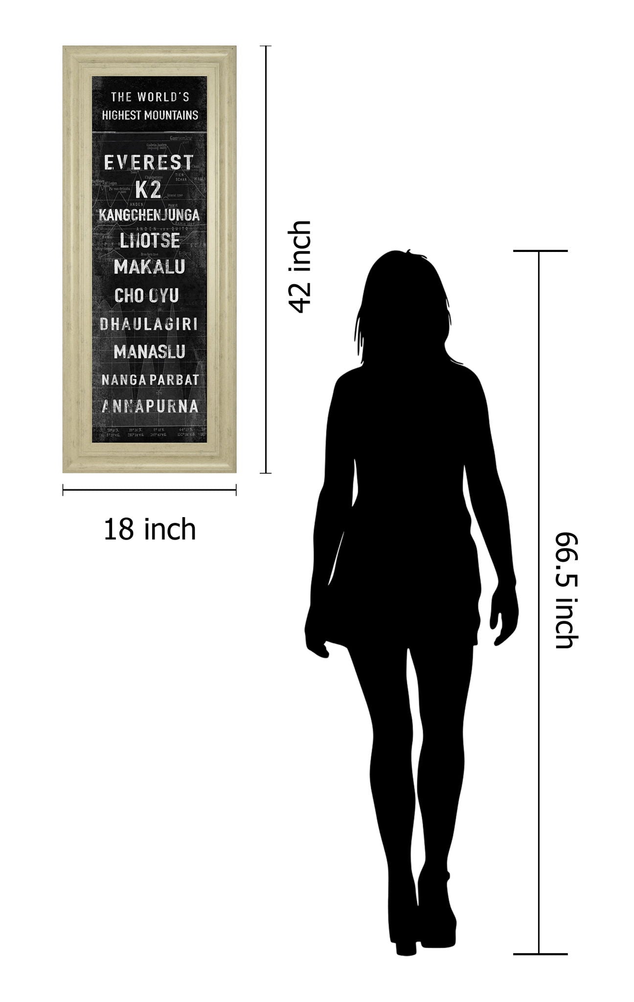 Celebrate the majesty of the world's tallest peaks with “The Highest Mountains,” a striking framed graphic art piece designed to inspire awe and adventure. This contemporary artwork lists iconic mountains like Everest and K2 in bold white typography against a textured black backdrop, enhanced by subtle topographic lines that add depth and intrigue. Encased in an elegant ivory bliss frame with premium real glass, this piece brings sophistication and a sense of exploration to any living room, office, or study. Crafted with expert care in the USA, it arrives ready to hang, making it a perfect statement for mountain lovers and wanderers alike.