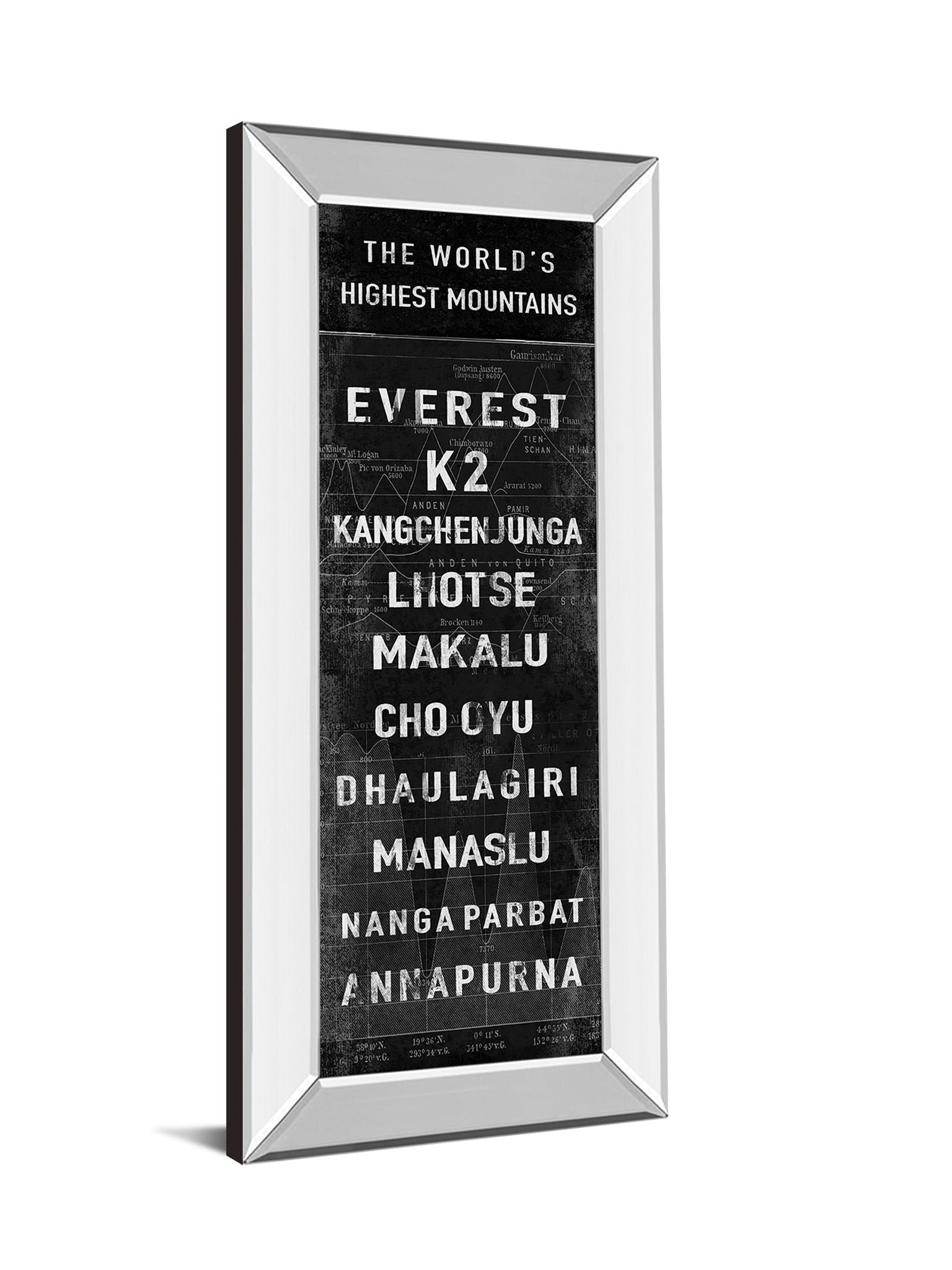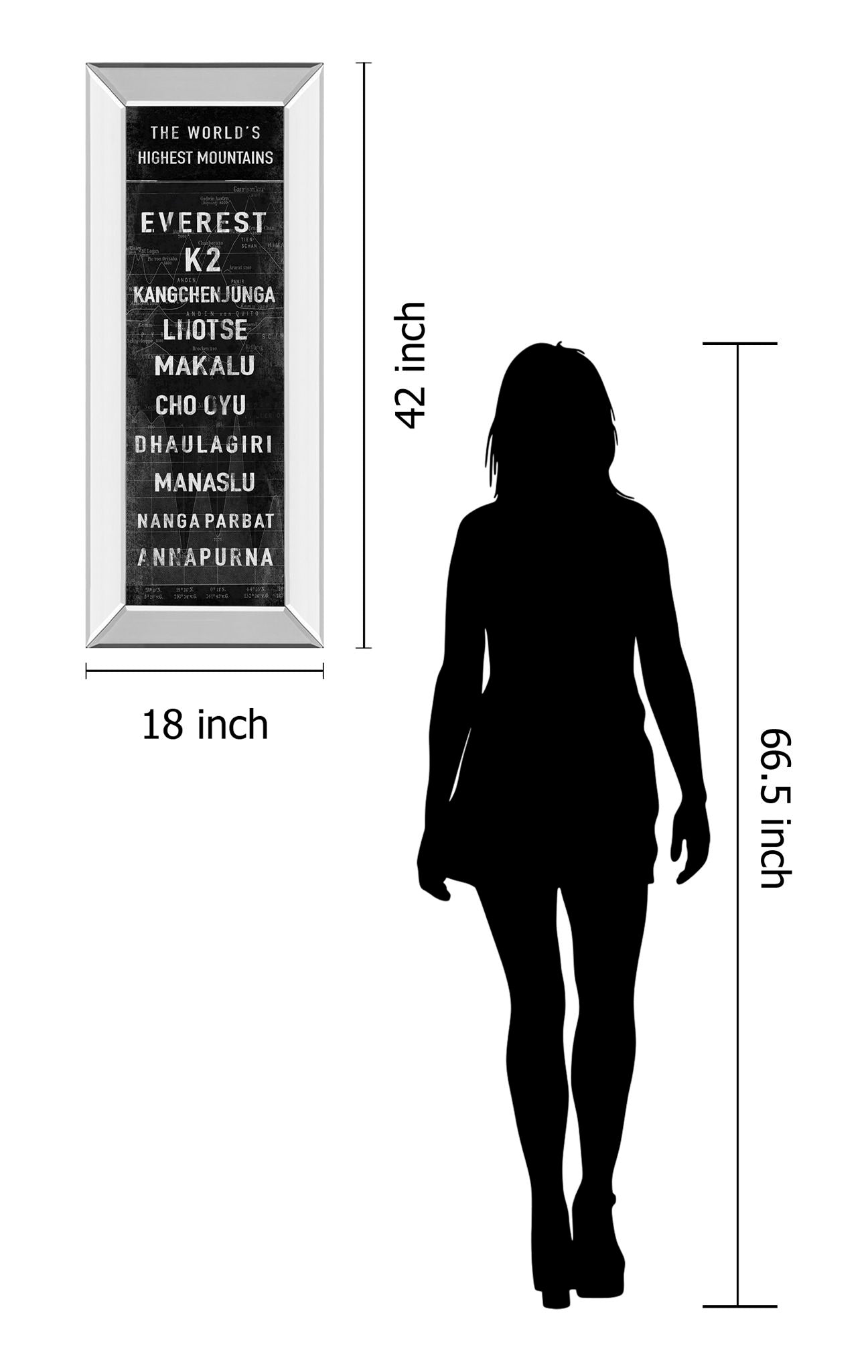 Celebrate the awe-inspiring grandeur of the world's tallest mountains with this captivating framed wall art. Featuring bold typography that names iconic peaks like Everest, K2, and Annapurna, the design is layered over subtle mountain chart details that invite exploration and wonder. Encased in a sleek 2.5-inch mirrored frame, the piece reflects light and adds a modern touch to any living room, office, or study. Protected by crystal-clear glass, the graphic art print combines contemporary style with a spirit of adventure, making it a perfect statement piece for those who appreciate nature's highest heights and the thrill of discovery.