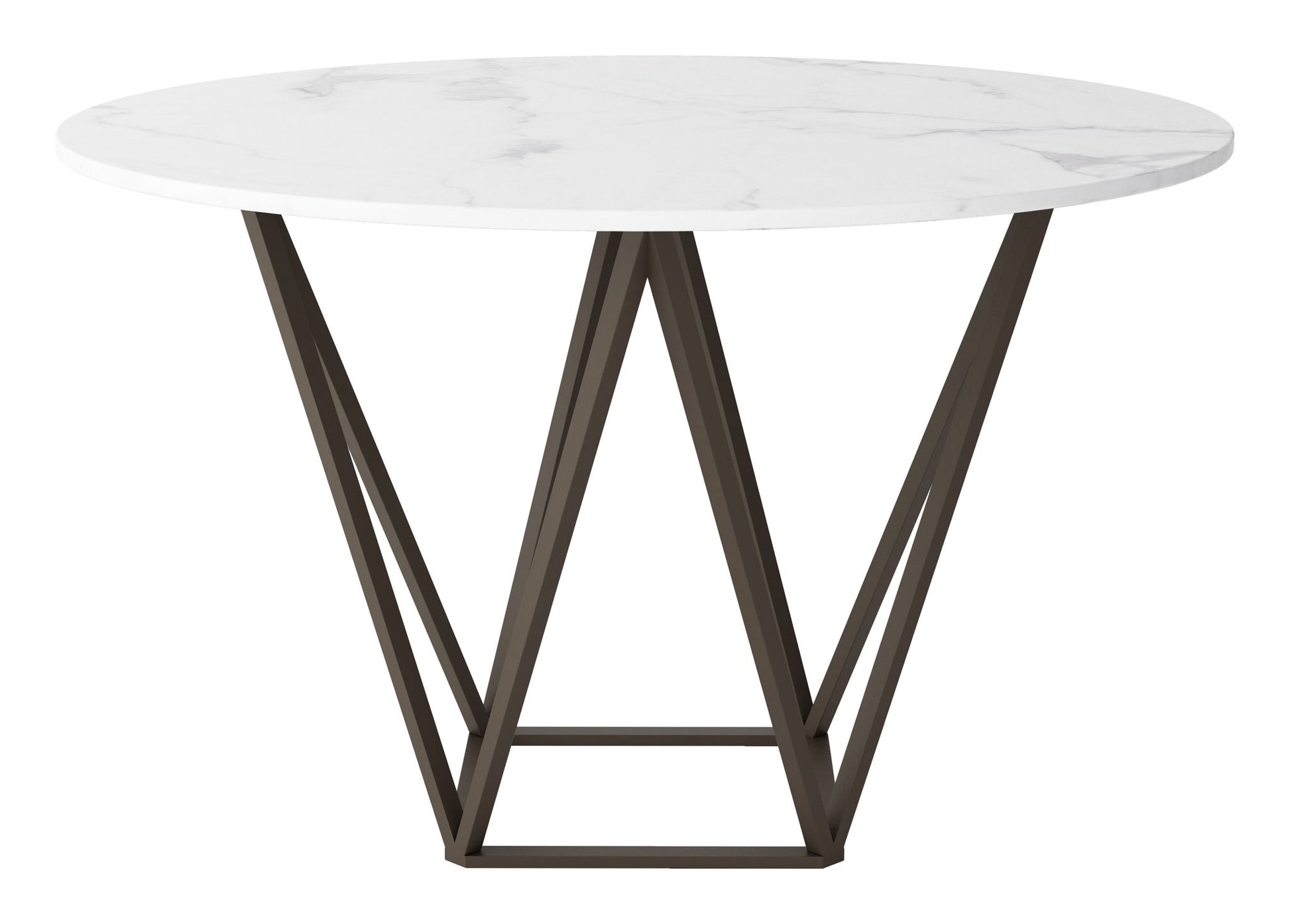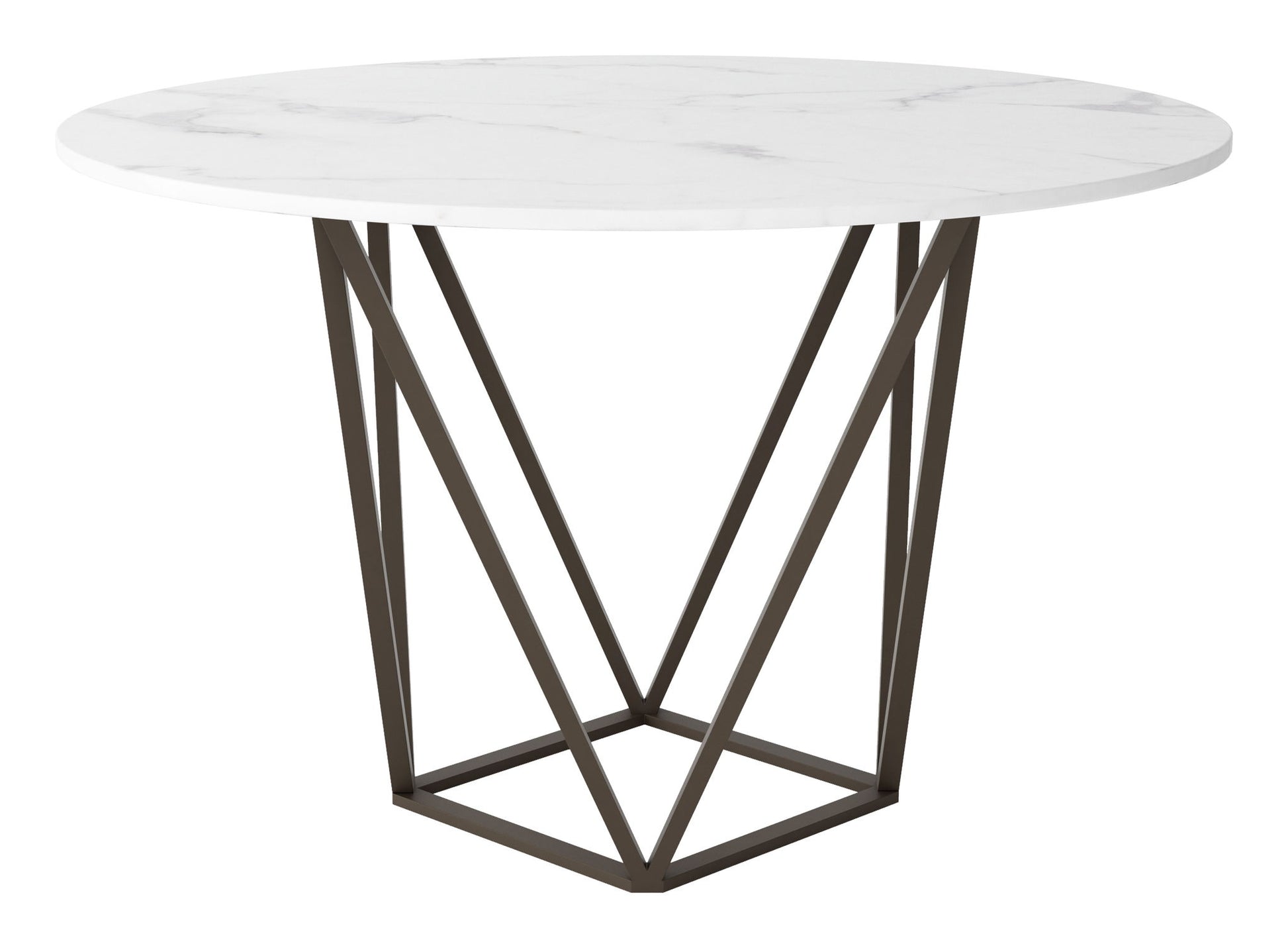 Perfect geometry. This gorgeous dining table with its smooth round marble-like top, rests on an architecturally inspired steel base for a look that is timeless. Its modern open-air design is perfect for small spaces. The substantial surface with a slightly tapered base will seat four comfortably.