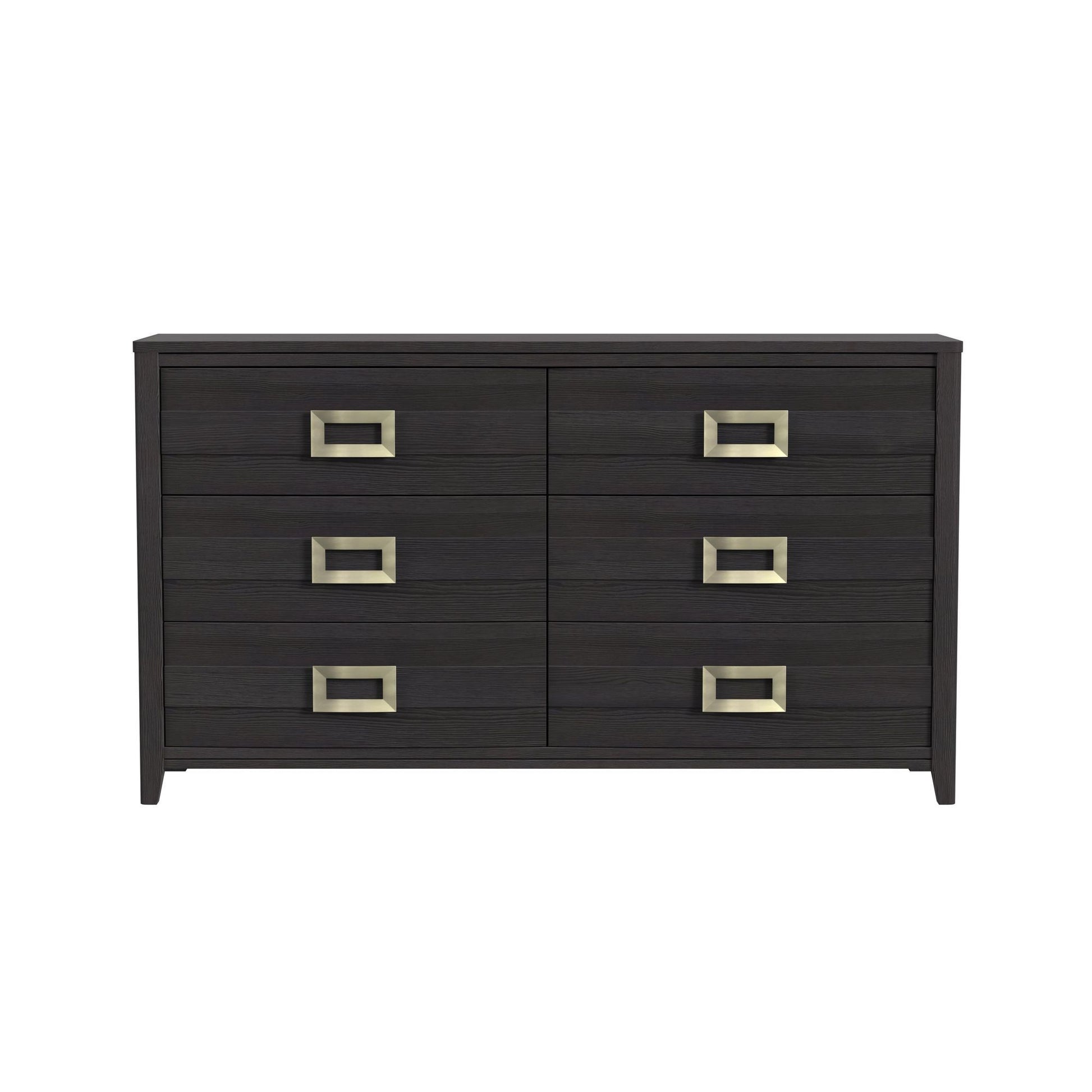 The Tobias 6-Drawer Dresser is a sleek and modern addition to your home. Designed with gently sloping horizontal slats that create uniquely rhythmic balance and robust silver drawer pulls that effortlessly draw the eye, this piece adds a sense of refinement to any space it occupies. Multiple drawers lend themselves to practical utility, while slightly beveled feet provide a firm and reliable foundation. For a piece that is sleek and stylish, the Tobias 6-Drawer Dresser delivers in quality and design.
