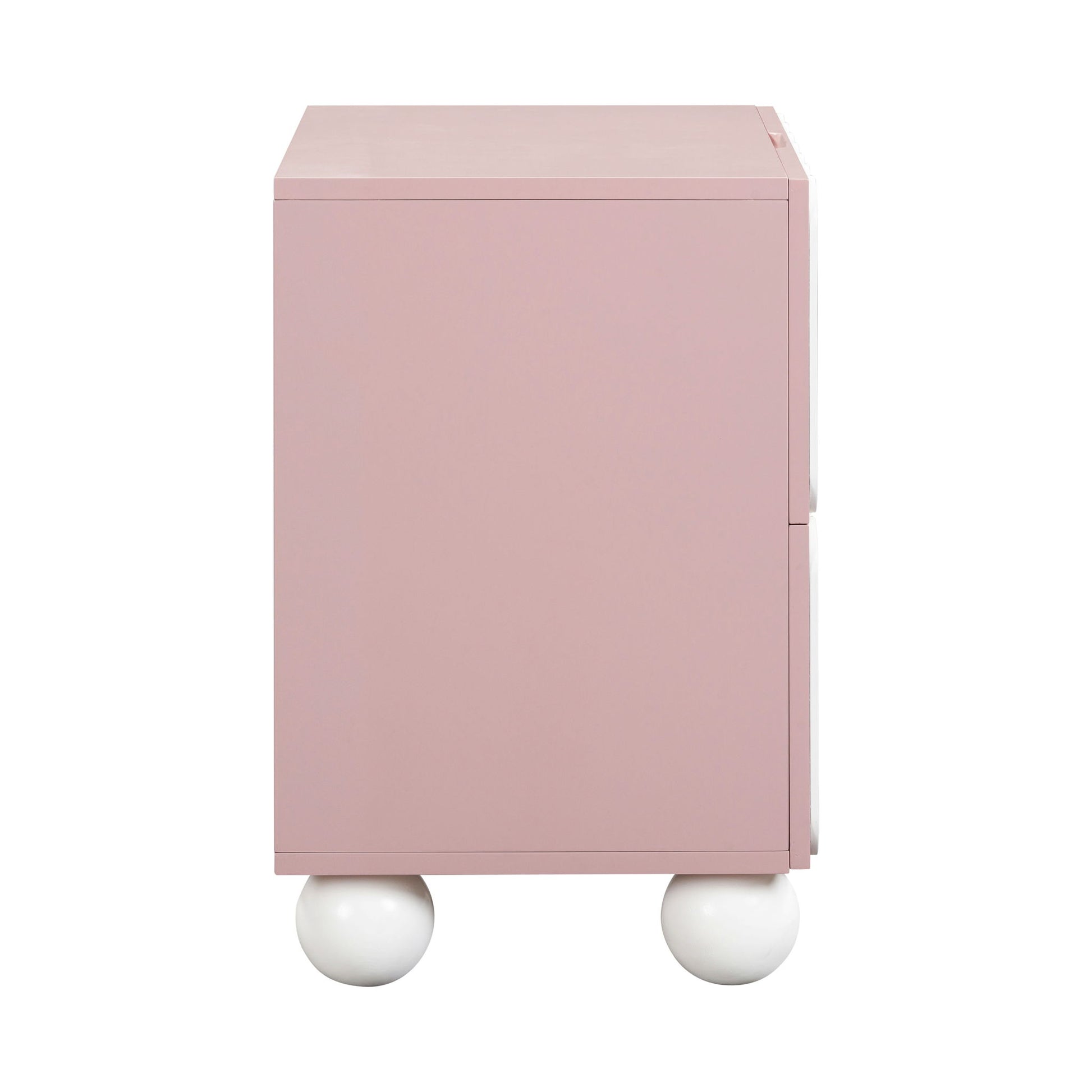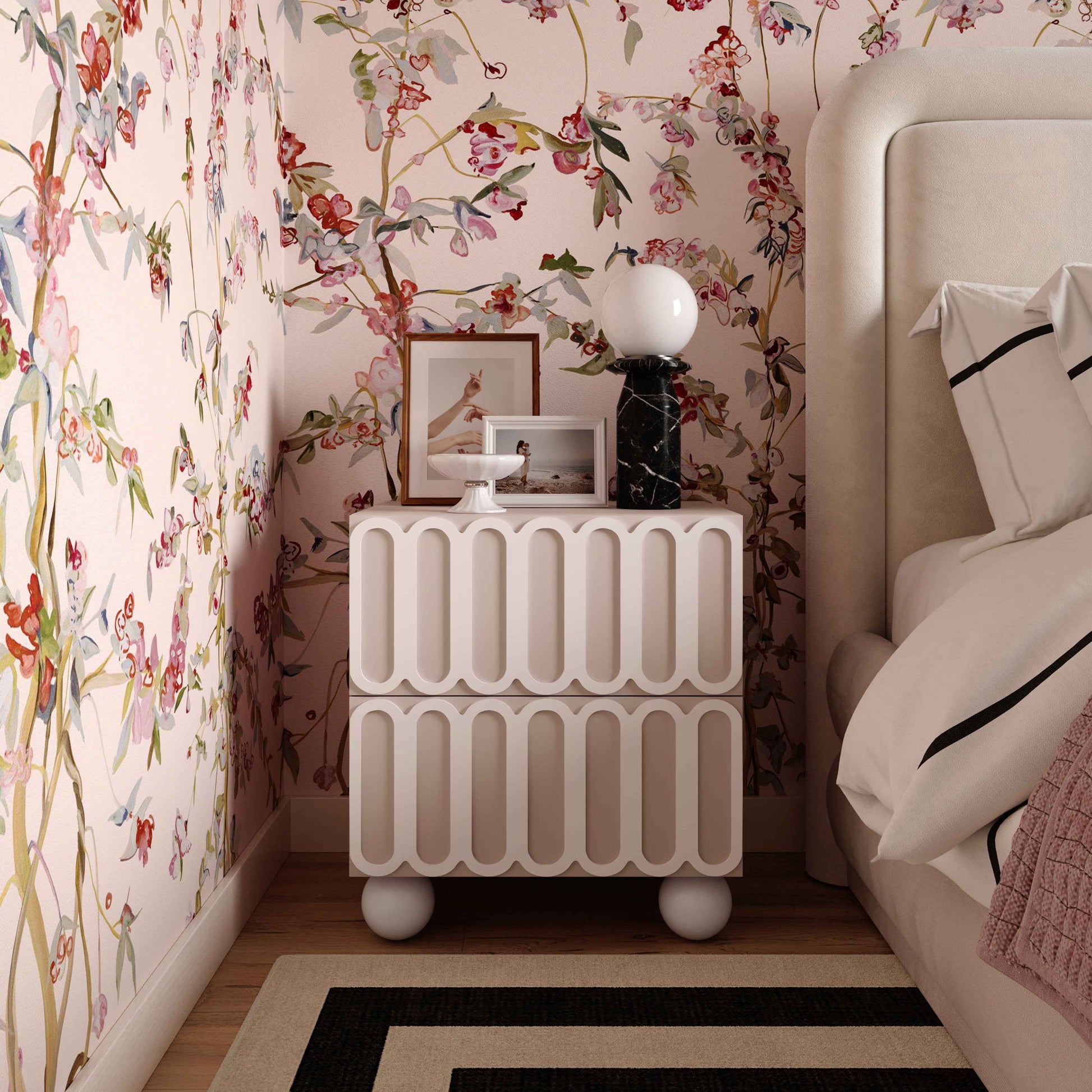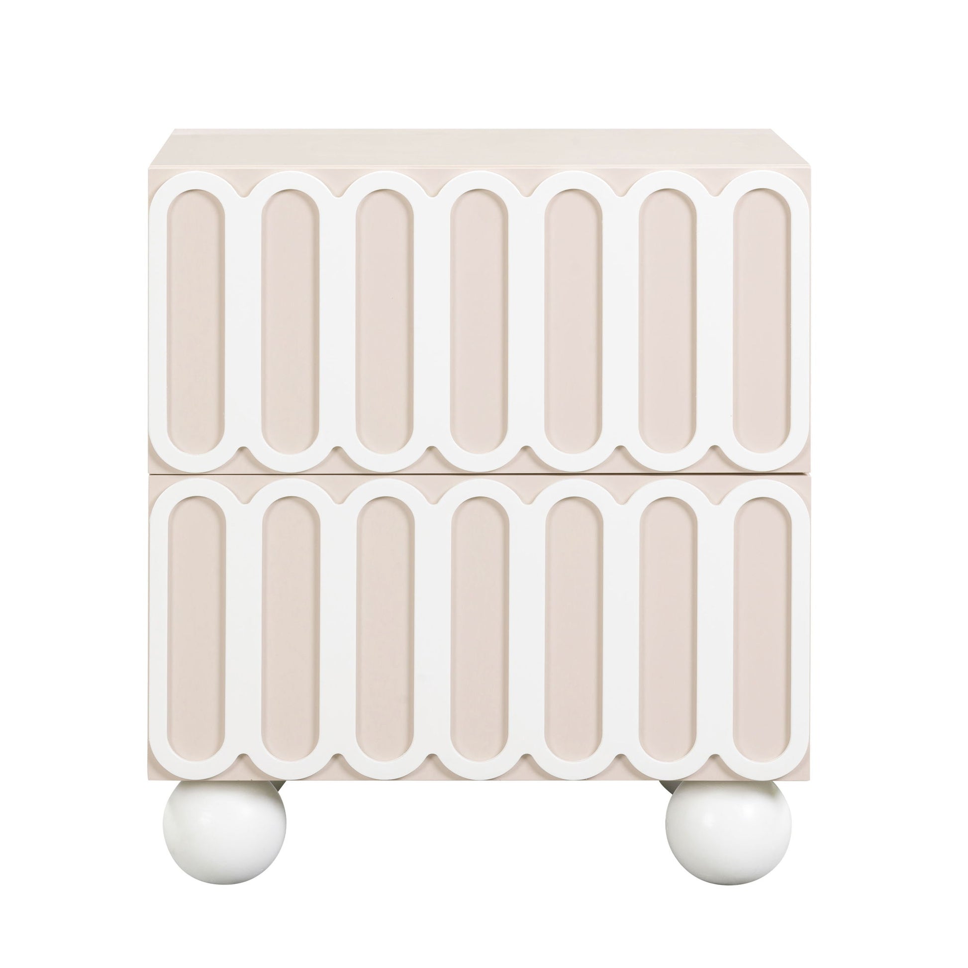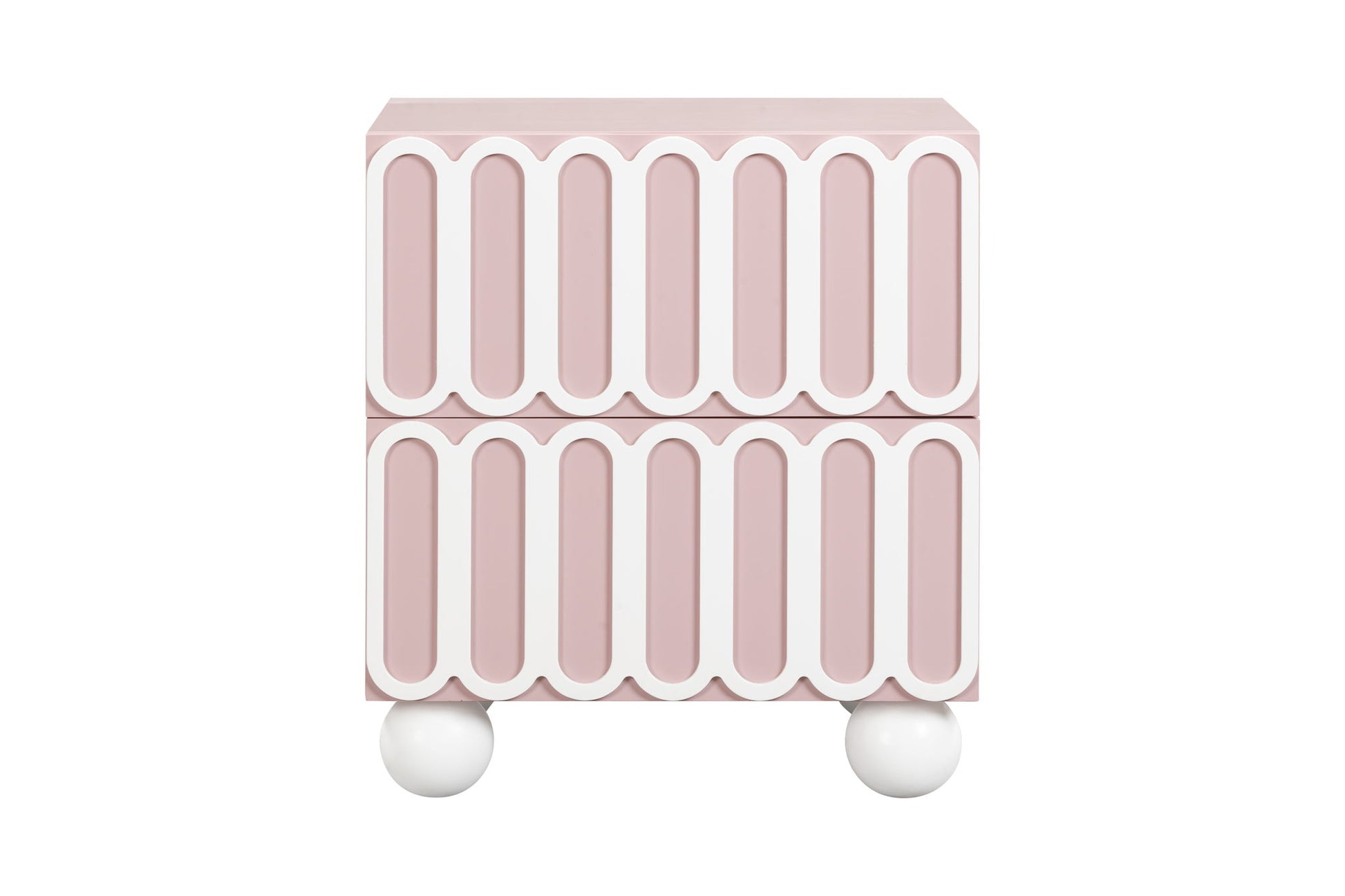 Say goodbye to a boring bedtime routine with the Tori Motif Nightstand, available in dreamy mauve and sophisticated taupe, each featuring a statement-making facade that truly pops. Its solid wood, spherical legs infuse a sculptural Hollywood buzz, while the medium sheen on the surfaces delivers just the right amount of drama without fussy maintenance. Plus, the nightstand's drawers glide smoothly on soft-close rails, ensuring you keep the morning peace, not waking your partner as you start your day.