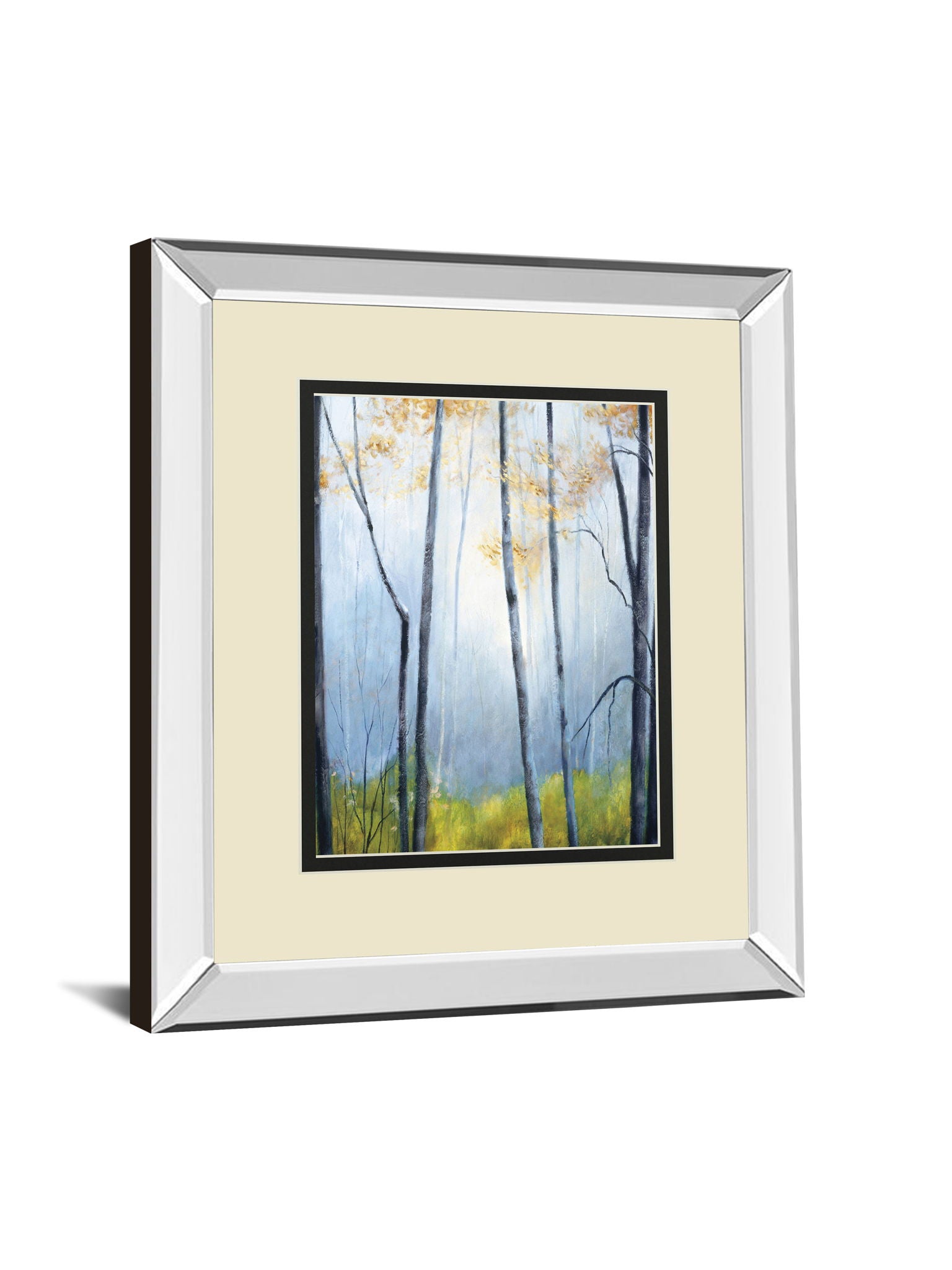Step into the quiet embrace of a misty forest with this framed wall art titled "Tranquil River." The scene captures slender trees reaching upward, their leaves touched by soft golden light that filters through a gentle blue haze. The lush green undergrowth contrasts with the delicate branches, evoking a peaceful, reflective mood that invites calm and contemplation. Encased in a sleek mirrored frame with double cream matting, this piece adds a sophisticated gallery feel to any living room or bedroom. Protected by real glass, it promises lasting beauty and a serene atmosphere that transforms your space into a tranquil retreat.