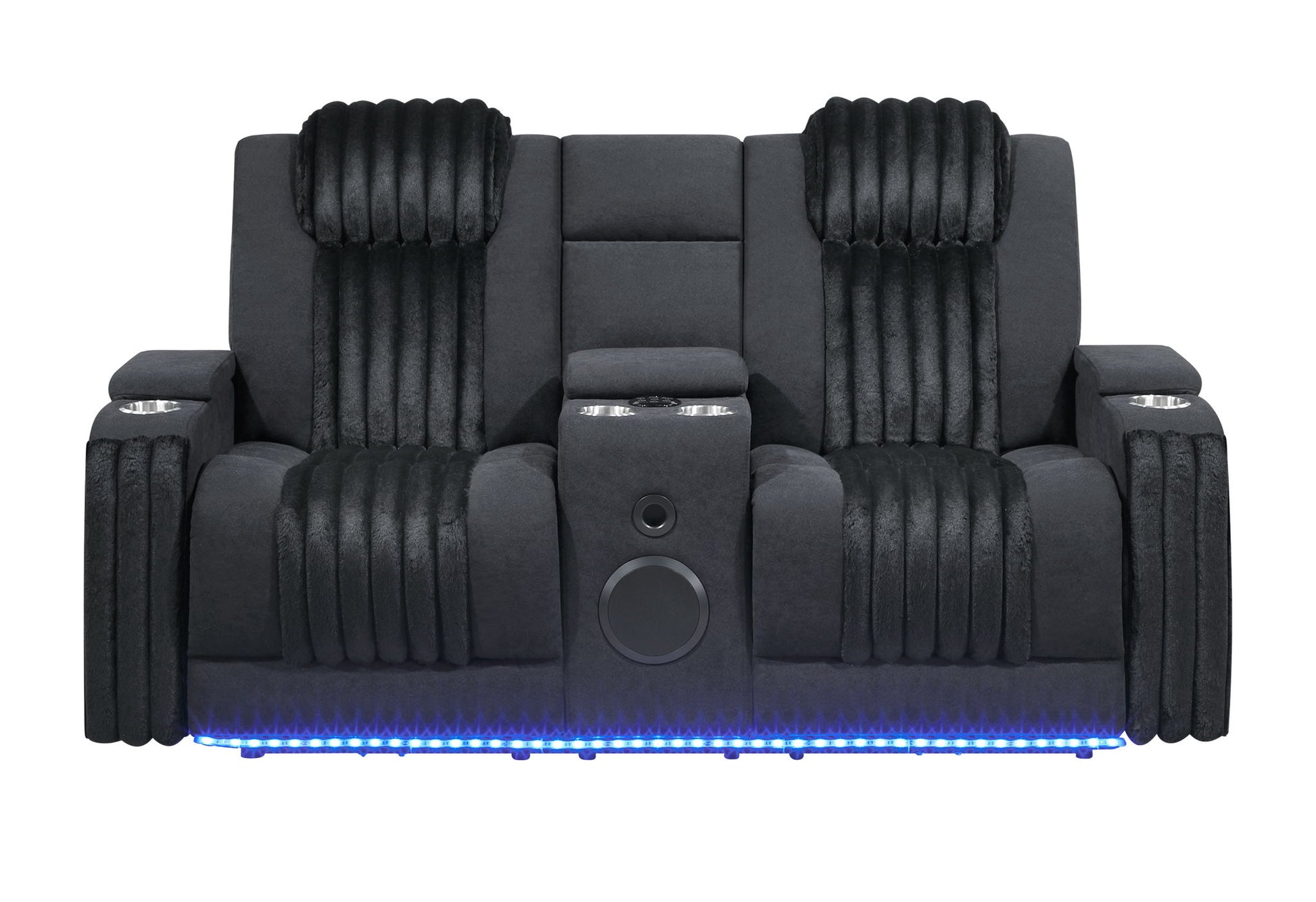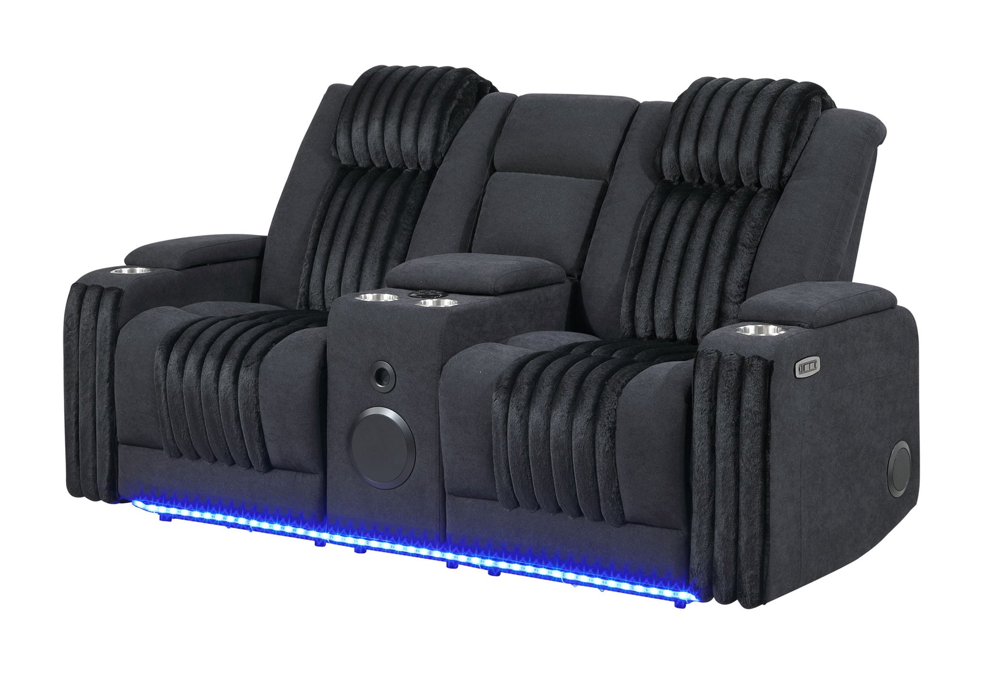The U8000 Black Console Reclining Loveseat pairs cutting-edge design with plush comfort. Finished in rich black upholstery with soft corduroy faux fur accents, it features dual power recliners, built-in LED lighting, and convenient cupholders. The center console provides ample storage and includes a Bluetooth speaker, delivering immersive sound for your favorite music or movies. A showpiece of comfort and style.