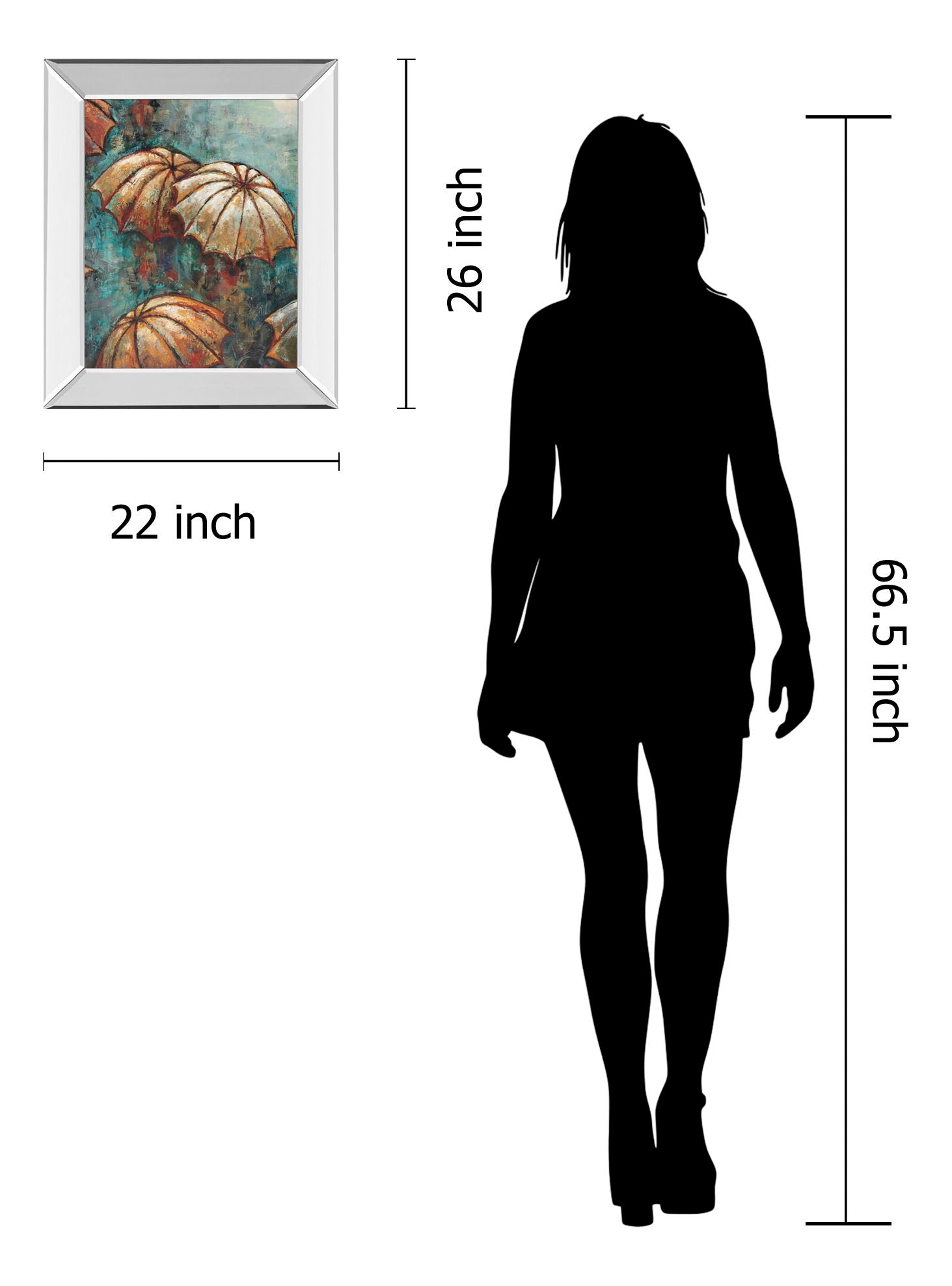 Immerse yourself in the vibrant dance of color and texture with this captivating 'Floating Umbrellas' framed wall art. The piece features an abstract depiction of umbrellas in warm oranges, beiges, and teals, evoking a sense of movement and whimsy. Enhanced by a sleek mirrored frame, the artwork reflects light beautifully, adding depth and modern elegance to any room. Crafted with premium real glass and mixed media techniques, it offers rich detail and durability. Perfect for living rooms, bedrooms, or offices, this ready-to-hang piece brings a sophisticated, contemporary touch to your space, inviting warmth and artistic intrigue.