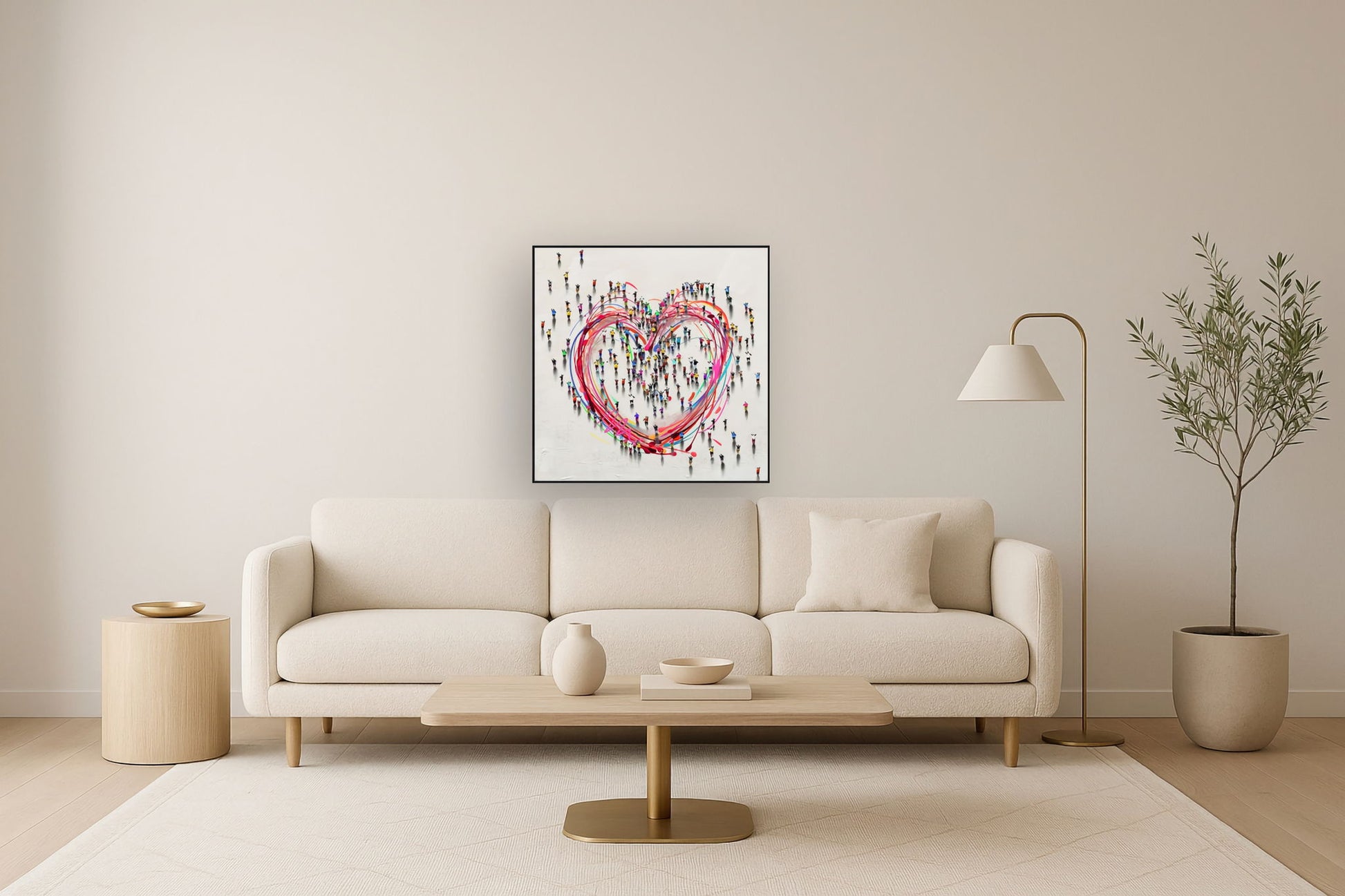 “Love for All” is a vibrant hand-painted canvas that celebrates unity and connection through a dynamic heart-shaped crowd scene. This mixed media piece combines high-quality canvas with hand-applied accents, adding texture and depth to the colorful figures that come alive against a soft neutral background. Perfectly framed in beige polystyrene, it arrives ready to display with professional mounting hardware, making it an inspiring addition to any living room, office, or bedroom. Each purchase supports a meaningful cause by providing a meal to a hungry American child, blending art with social impact.