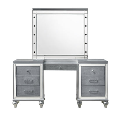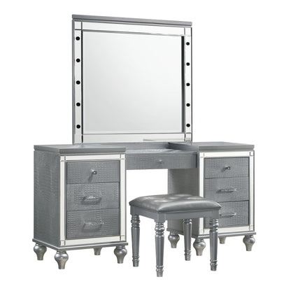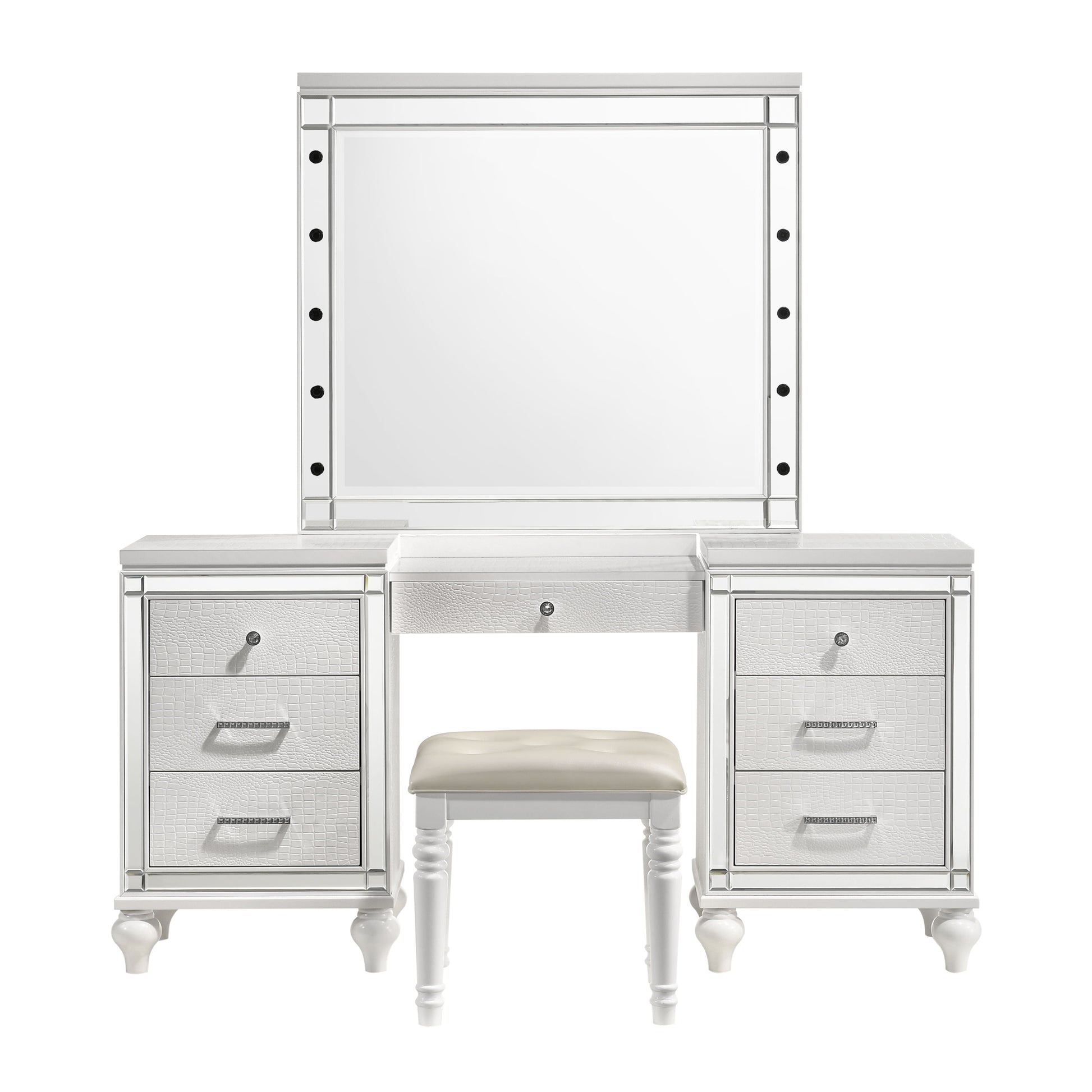The Valentino Vanity is a stunning addition to any bedroom or dressing area. Made from a combination of manufactured and solid woods with decorative embossed inlays, this set ensures long-lasting quality and distinctive style. The gleaming finish, mirrored trims, crystal-studded drawer pulls, and alligator embossed inlays evoke a Hollywood glam appeal. The seven-drawer vanity table provides ample storage for cosmetics and accessories, including a velvet-lined drawer for jewelry, making it as practical as it is stylish. This exquisite vanity set seamlessly combines functionality with a touch of star quality, bringing an elegant and glamorous touch to your space.