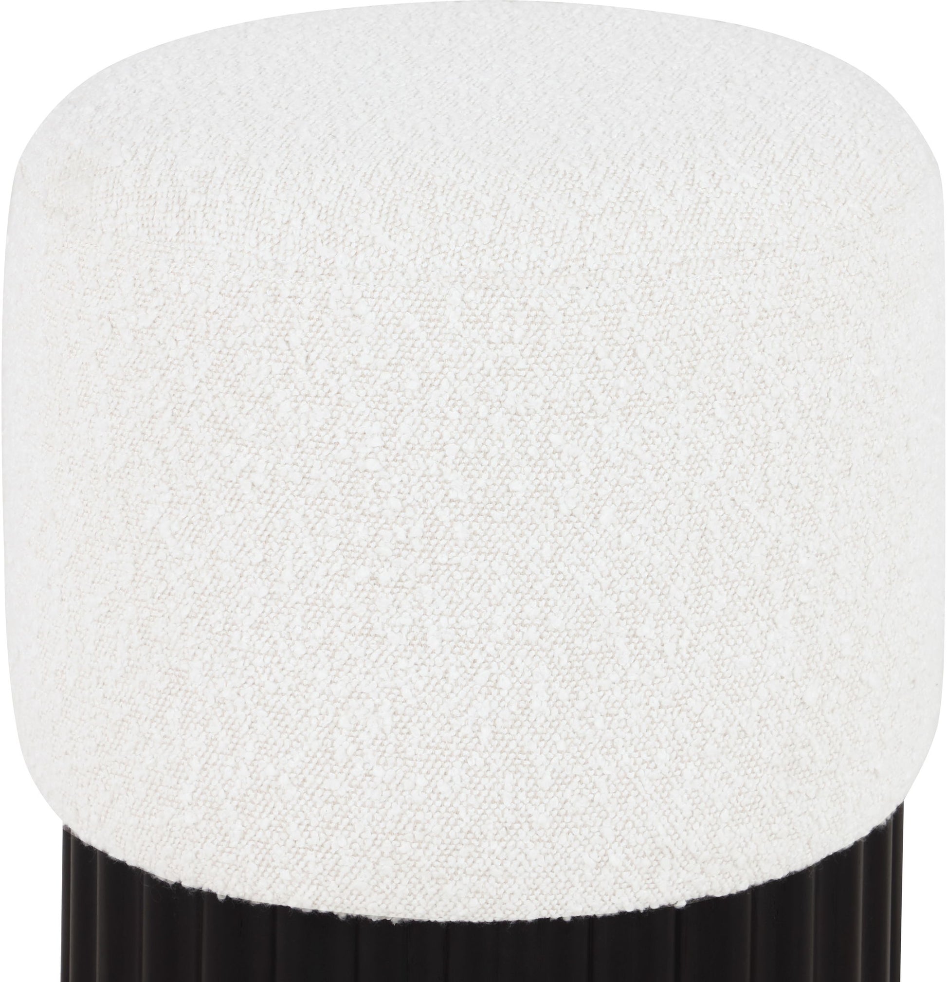 Indulge in the luxurious texture of the Veranda Boucle Fabric Ottoman/Stool. It boasts a rich boucle fabric that is paired with an elegant and sturdy solid wood base, featuring a black finish that highlights the beautiful wood grain patterns. This unique combination of materials creates a perfect blend of style and durability, making it an ideal addition to any modern or traditional interior design.