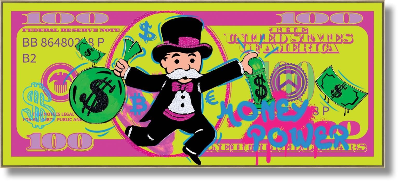 This vibrant "Money Power Mixed Media Art" piece is a contemporary celebration of wealth and influence, blending playful imagery with bold colors and textures. Featuring a charismatic figure holding cash against a striking backdrop of stylized currency and graffiti-like accents, this artwork captures the energy and allure of financial power. Hand-embellished with foil and textured rocks on a durable canvas base, it offers a glossy finish that enhances its vivid details. Perfect for youth rooms or modern living spaces, it arrives framed and ready to display, making a dynamic statement wherever it is placed.