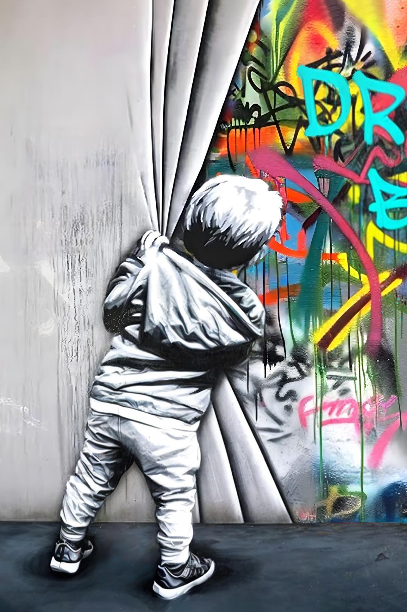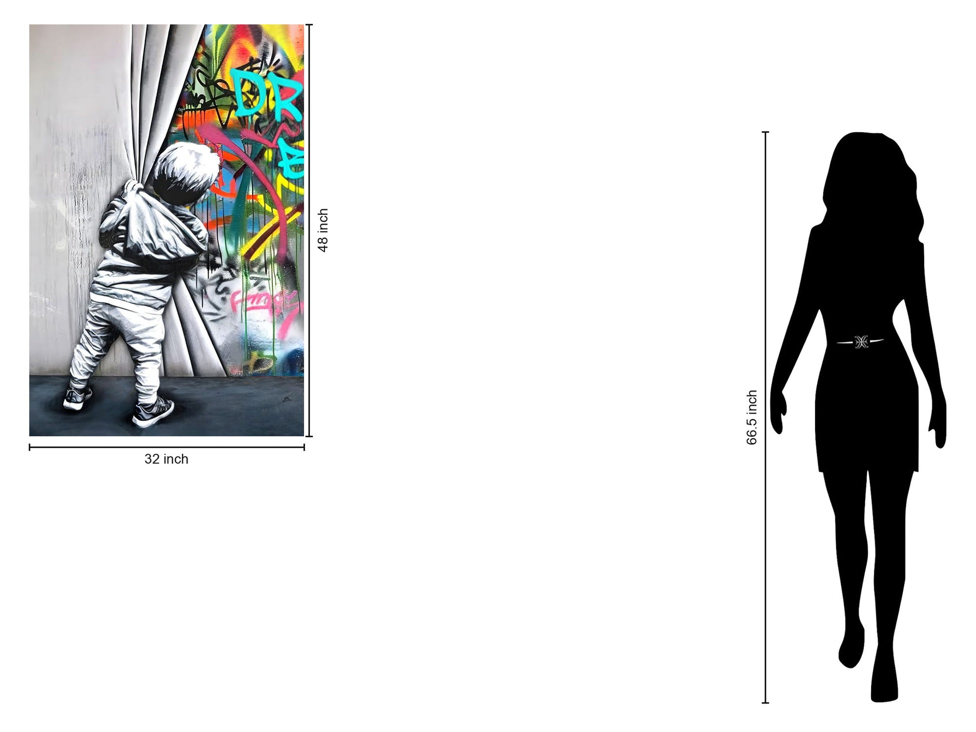 “Pull it Back” captures a poignant moment of childhood curiosity and wonder through a striking hand-painted gloss canvas. This contemporary graphic art piece features a young child pulling back a curtain to reveal a vibrant, colorful graffiti wall, symbolizing the unveiling of hidden worlds and imagination. The high-gloss finish enhances the depth and texture, while the hand-applied accents add a unique tactile quality, making this artwork a captivating focal point for any living room, office, or modern space. Ready to hang with professional mounting hardware, it combines artistic expression with effortless display.