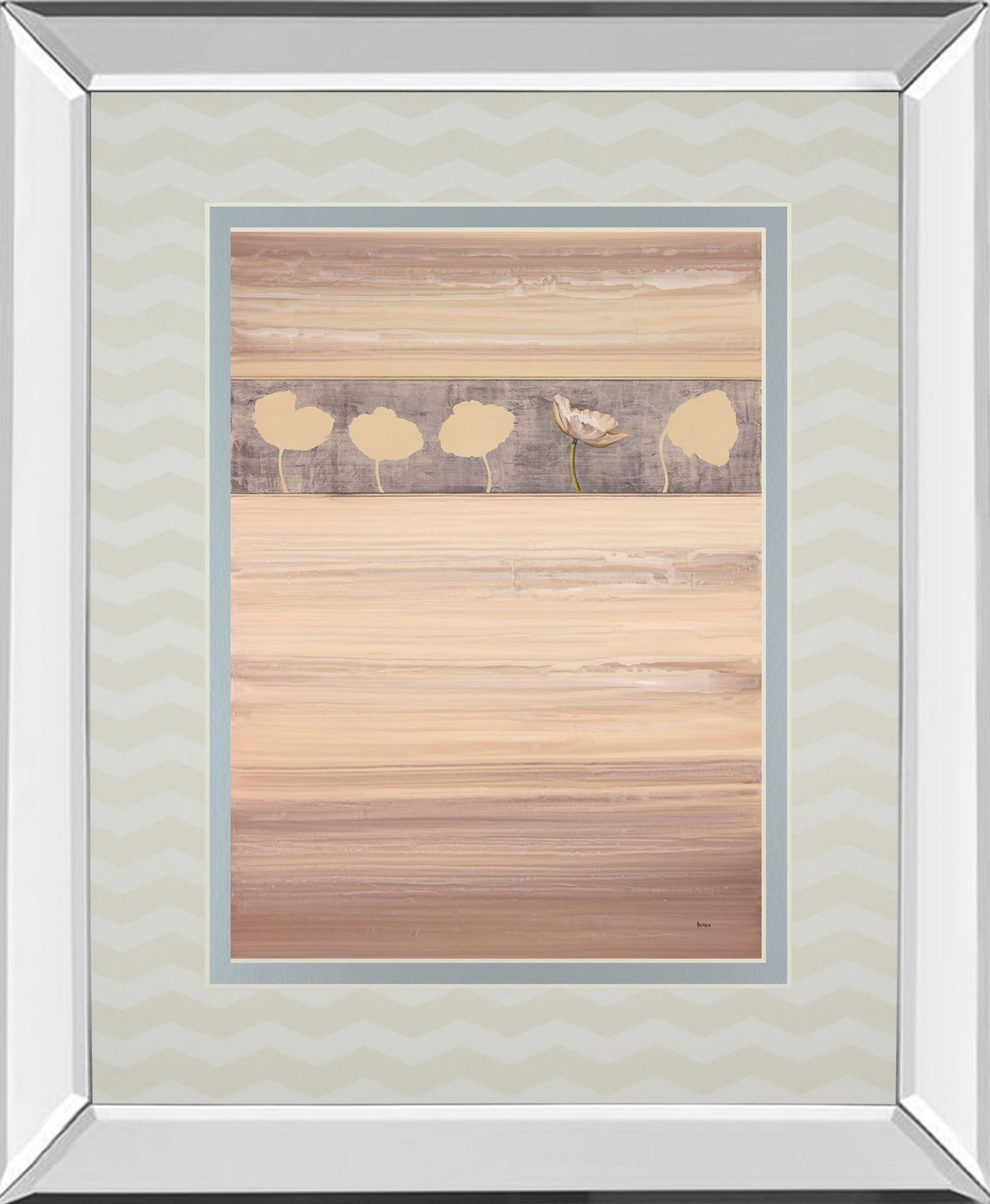 Immerse your space in the tranquil elegance of "White Passion," a contemporary botanical wall art that captures the subtle beauty of nature. This piece features a delicate row of floral silhouettes set against soft, muted horizontal bands in beige, cream, gray, and hints of blue and brown, evoking a serene and peaceful ambiance. Encased in a sleek 2.5-inch mirrored frame, the artwork is enhanced by a double-matted design with gentle chevron patterns, offering a refined gallery-style finish that protects the vibrant details under premium real glass. Perfectly sized at 34 by 40 inches, it is ready to hang and ideal for adding a touch of modern sophistication to living rooms, bedrooms, or offices. Its understated palette and elegant composition make it a timeless addition that effortlessly elevates any contemporary décor with a sense of calm and luxury.